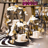 Elaborate black birdcage with white orchids and gold petals. This display is a beautiful way to present candles or for perfectly serving pastries for an afternoon tea. Available in three sizes. Material - Metal Price on request.