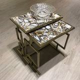 Table nest with mesmerizing rectangular agate top in two sizes. The geometric gold frame is a head-turner, making this piece more modern and standout. What's more, you can eliminate negative vibes in the room with this impressive Agate piece that can cleanse and stabilize your aura. Dimension of Medium Table - Price on request. |